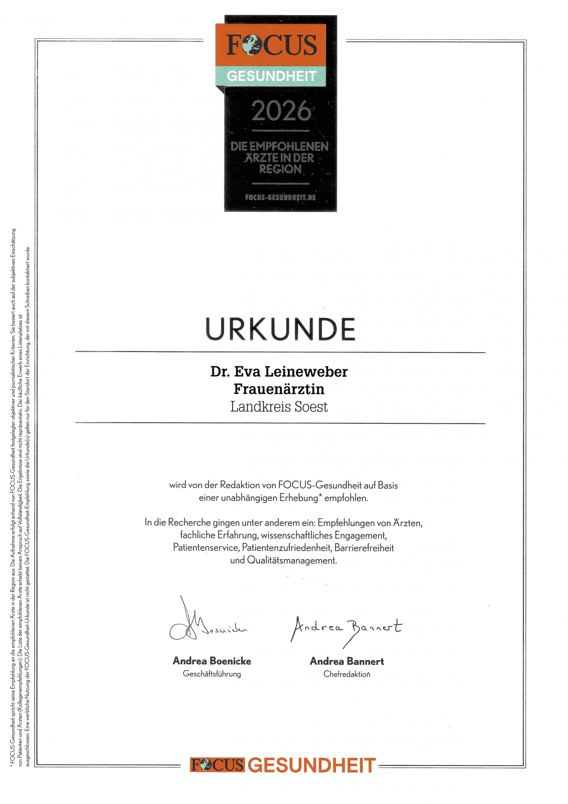 Auch für das Jahr 2025 wurde, wie auch schon oft zuvor, Frau Dr. Eva Leineweber vom Focus Gesundheit als Frauenärztin für den Landkreis Soest empfohlen. Wir sind als gesamtes Team stolz auf diese Leistung.
